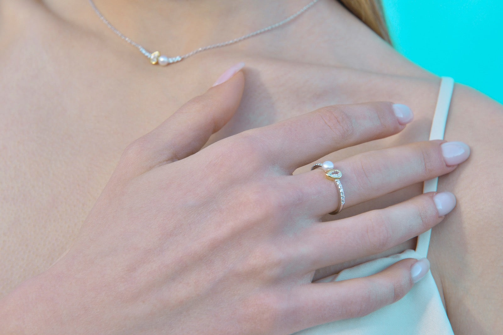 RING SILVER 925 PLATED RHODIUM AND GOLD PEAR CZ WHITE FRESH WATER PEARL